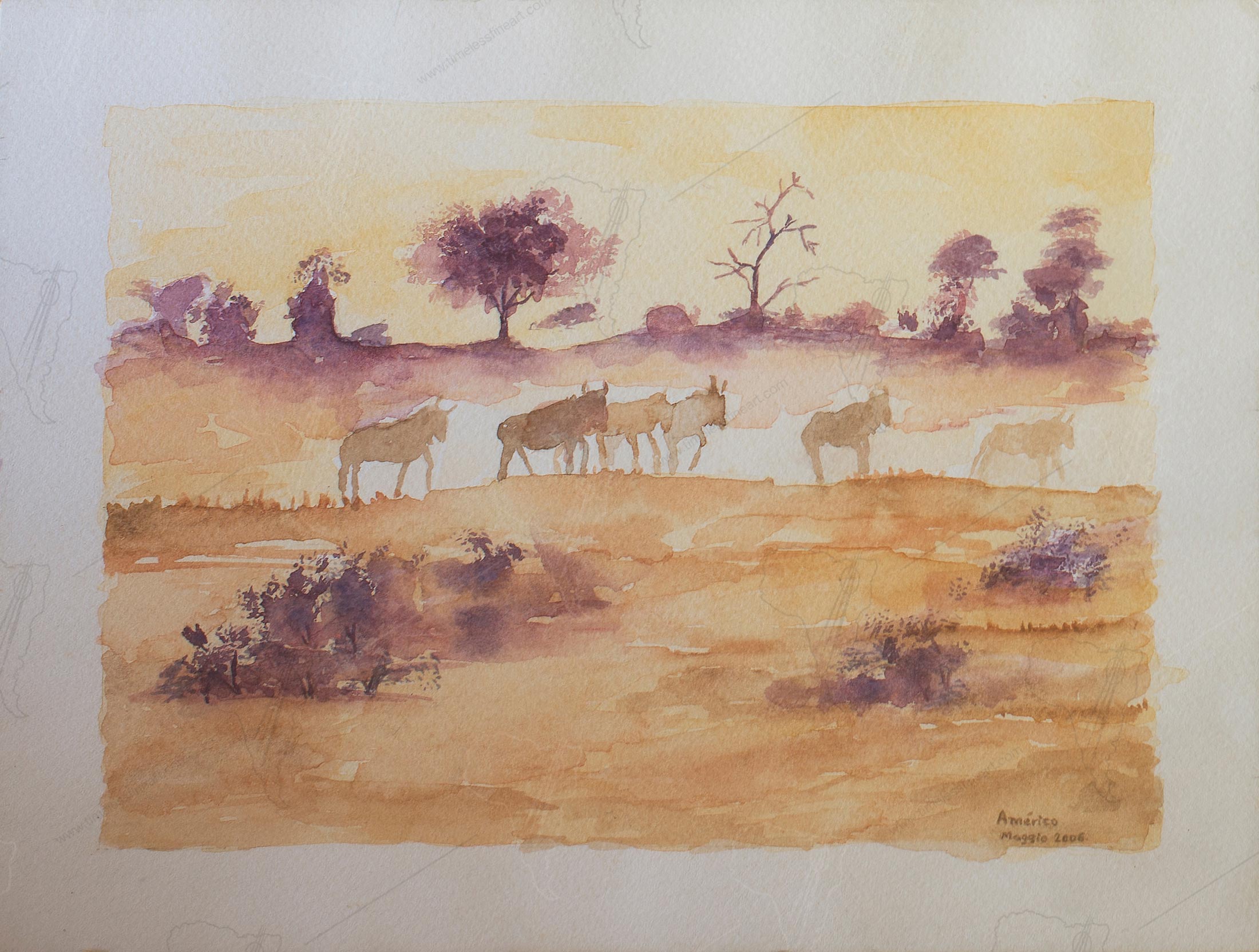 Nella luce che svanisce sulla savana, un gruppo di gnu si muove con ritmo pacato attraverso la terra. L’acquerello cattura un momento sospeso — dove movimento e quiete si incontrano, e il calore del giorno lascia spazio alla calma.