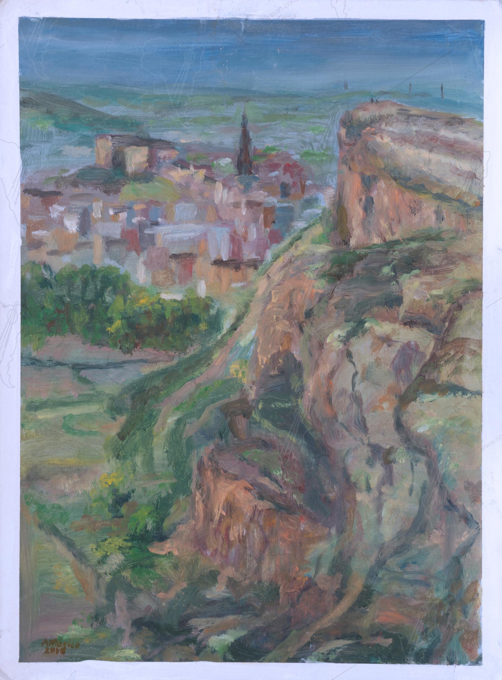 Vista da Arthur’s Seat, la città si estende in lontananza sotto un cielo mutevole. L’opera cattura il dialogo tra la pietra e il paesaggio, tra la permanenza del luogo e la fuggevole luce del giorno.